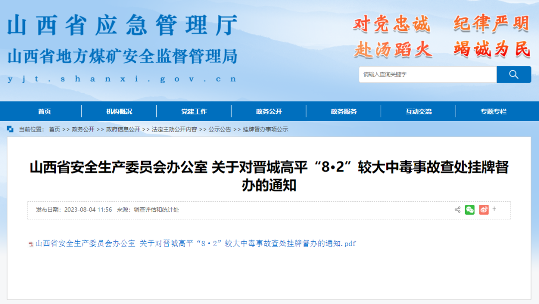 84日山西省安委辦發(fā)布通知對“8·2”較大中毒事故查處實行掛牌督辦