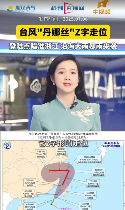 今年第 4 號臺風 “丹娜絲” 來勢洶洶,已于 7 月 7 日凌晨 0 點前后以臺風級(13 級,40 米 / 秒)登陸臺灣嘉義縣沿海,隨后強度逐漸減弱。截至 7 日早晨 5 點鐘,其中心位于浙閩交界南偏東方約 235 公里的海面上,正以每小時 15-20 公里的速度向北偏東方向移動,預計 8 日早晨起轉向西偏南,逐漸向浙江臺州至福建福州一帶沿??拷瑢⒂?8 日下午到夜間在上述沿海二次登陸,登陸時強度為熱帶風暴級(8-9 級,18-23 米 / 秒)。