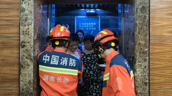 8 月 18 日晚 22 時 36 分,芙蓉區(qū)英尚國際大廈突發(fā)電梯故障,3 號、4 號電梯先后停運,致使 28 名市民被困。芙蓉區(qū)消防救援大隊五一廣場消防站接警后,火速趕赴現(xiàn)場。
