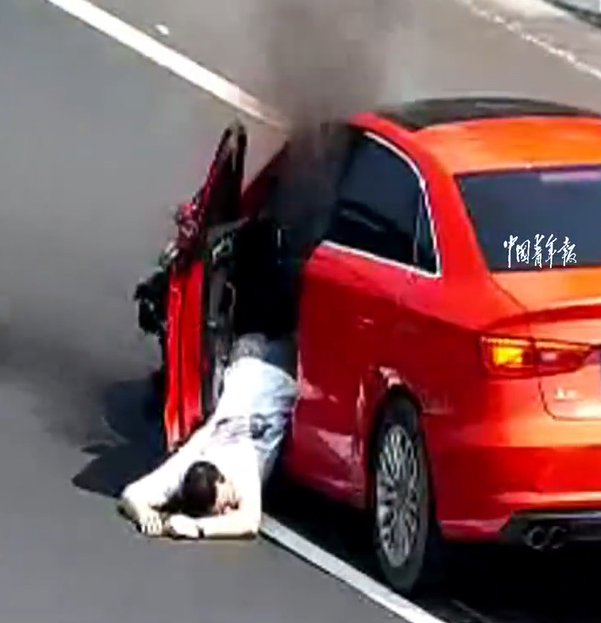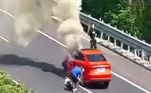 車流如織的高速公路上,危險(xiǎn)毫無征兆地降臨。一輛轎車突發(fā)事故,車頭瞬間被滾滾濃煙吞噬,駕駛員在車內(nèi)掙扎,試圖推開車門自救,可濃煙嗆得他咳嗽不止,體力迅速流失,車門只開了半扇,他卻已沒了脫身的力氣。