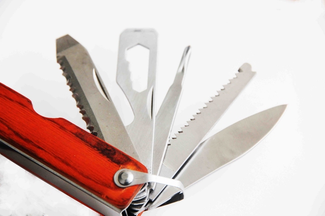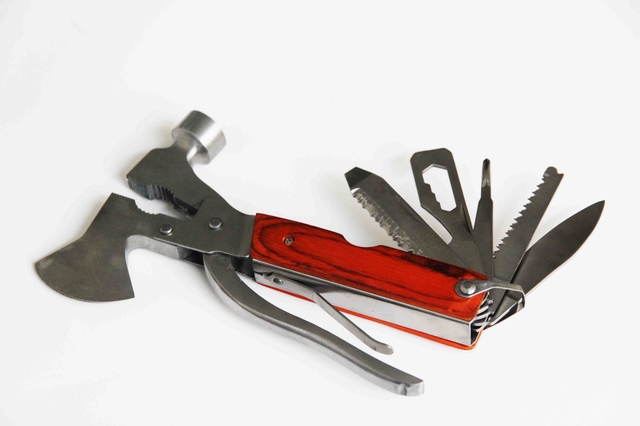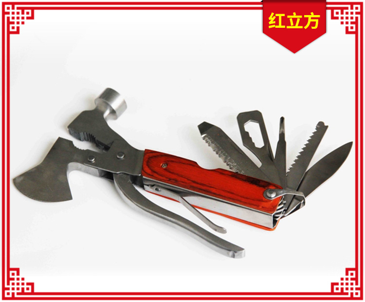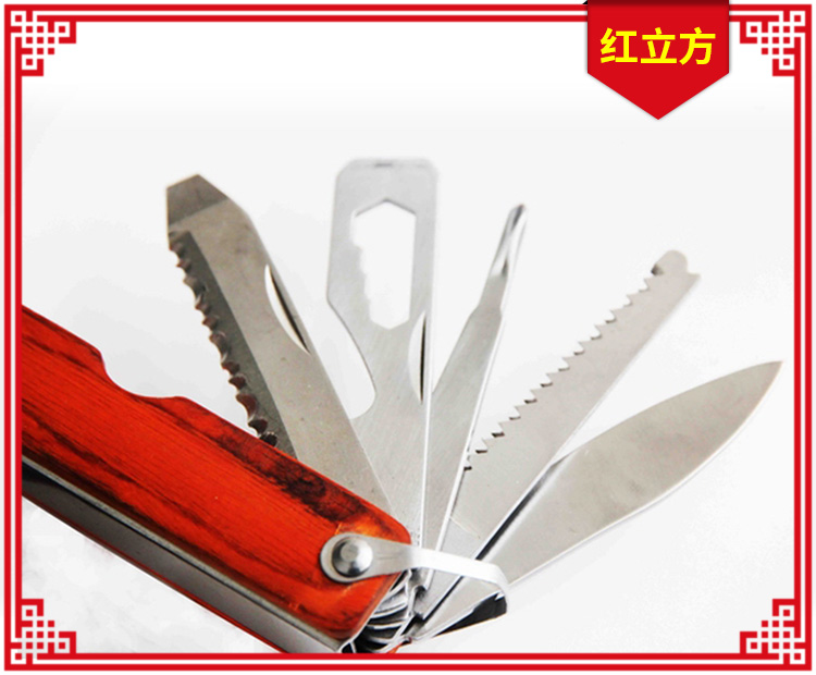 【主要工具】1.鉗子;2.十字螺絲刀;3.雙面戳刀;4.木鋸刀;5.小刀;6.開瓶器;7.一字改錐;8.拔木塞器;9.鋼絲剪;10.斧子;11.錘子及防身等多種功能